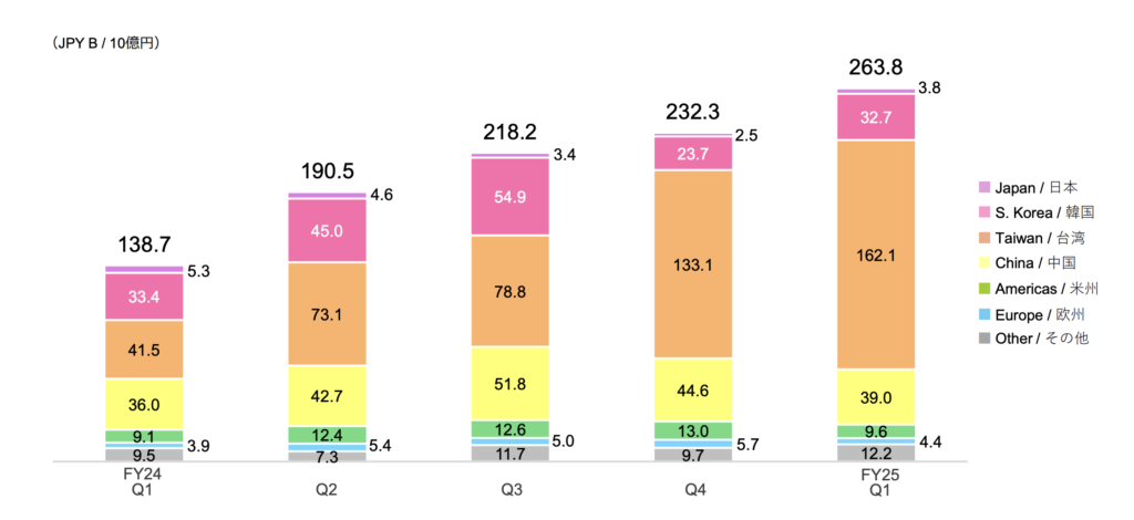 このように、同社の事業はグローバルな半導体サプライチェーン全体に深く組み込まれており、特にAI向け半導体の製造拠点が集中する台湾市場での存在感が際立っています。