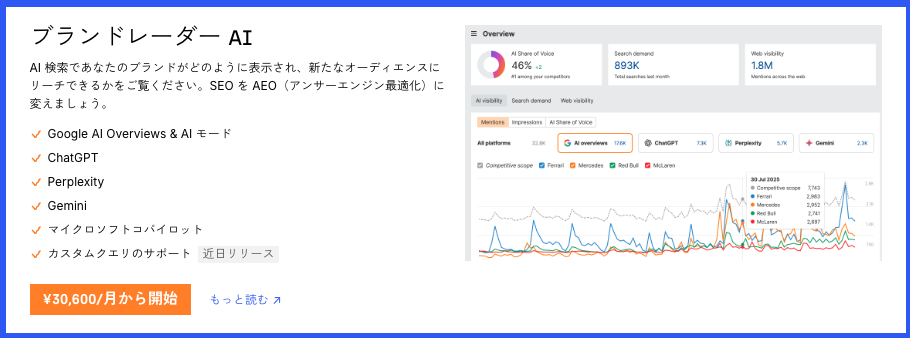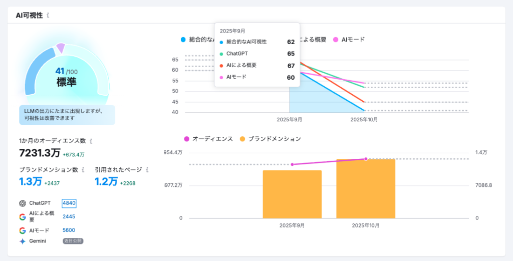| AI可視性モニタリング | ChatGPT、Perplexity、Gemini等での自社ブランドの言及頻度を追跡 | 現状把握と改善の起点 |