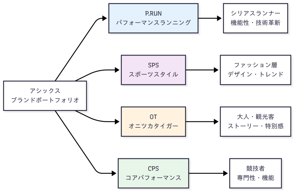 つまり、同じ「アシックス」というブランドの下でも、それぞれのカテゴリーが異なる市場を攻めているわけです。これは「ブランドポートフォリオ戦略」の好例といえます。