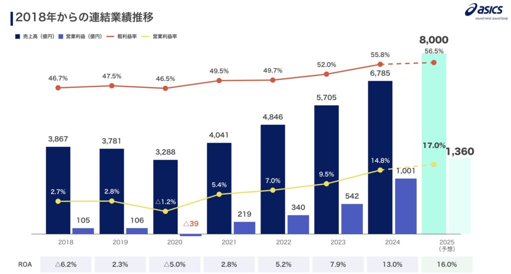 アシックスが2025年8月に発表した中間決算は、単なる「好決算」ではありません。2026年に掲げていた中期経営計画の目標を1年前倒しで達成する見込みとなり、通期の業績予想を大幅に上方修正しました。売上高は8,000億円、営業利益は1,360億円、営業利益率は17.0%という数字の裏には、緻密なマーケティング戦略と市場対応があります。