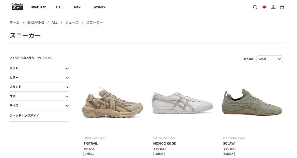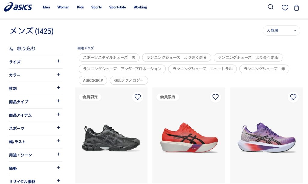 主要カテゴリー | パフォーマンスランニング(P.RUN)、スポーツスタイル(SPS)、オニツカタイガー(OT)など |