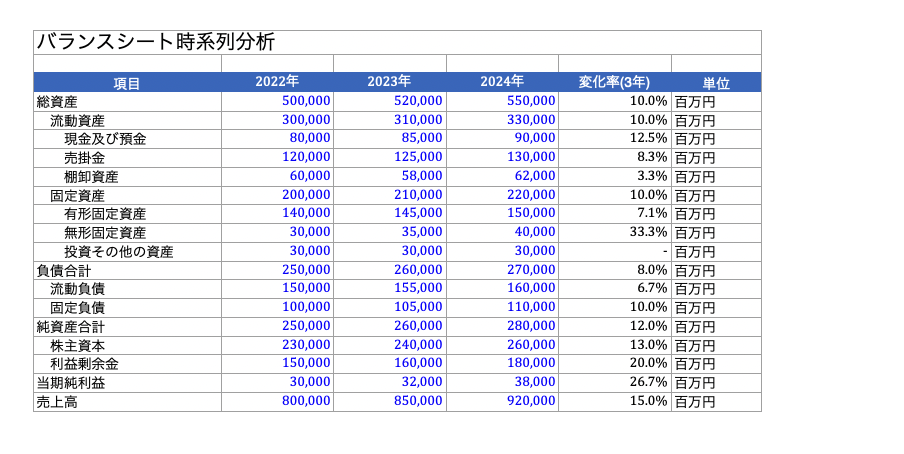 | 時系列分析の重要性 | 最低3年分のデータを比較し、トレンドを把握する。1年だけは危険 | 過去3年分のB/Sをエクセルに入力する |