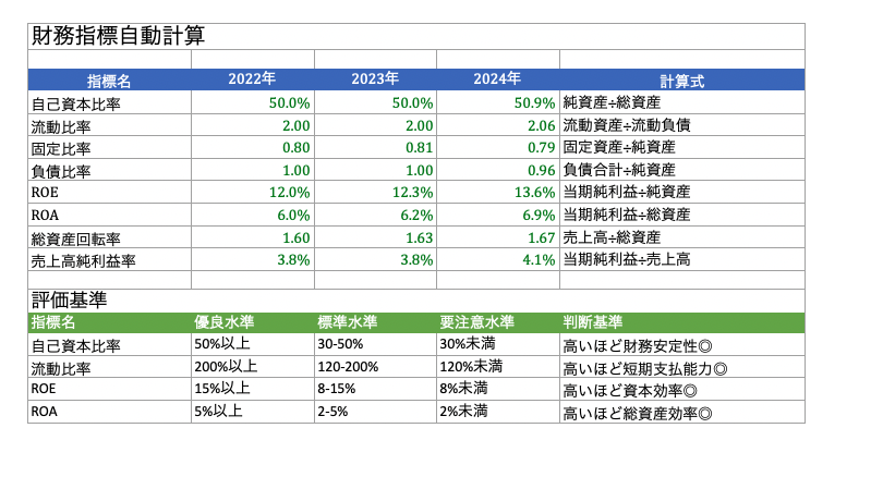 | 3つの分析視点 | ①安全性(倒産リスク) ②収益性(稼ぐ力) ③成長性(トレンド)から多角的に評価 | 自己資本比率、ROE、ROAを計算してみる |