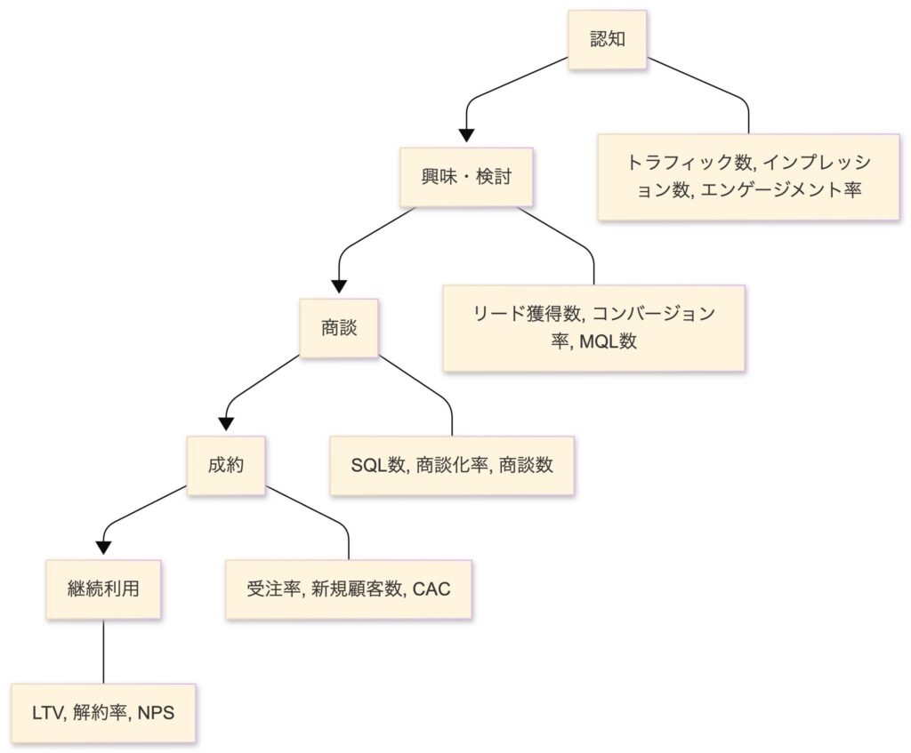 - マーケティングファネルに沿った指標設定: 顧客の購買プロセスに合わせてKPIを設定する