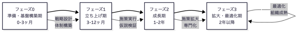 | フェーズ0: 準備・基盤構築期 | 0-3ヶ月 | 戦略策定、初期体制構築 | 1-2名 |