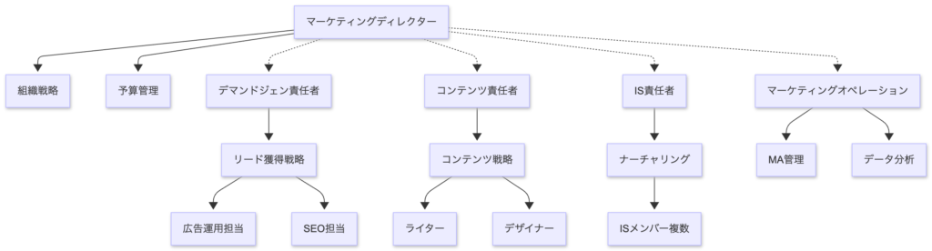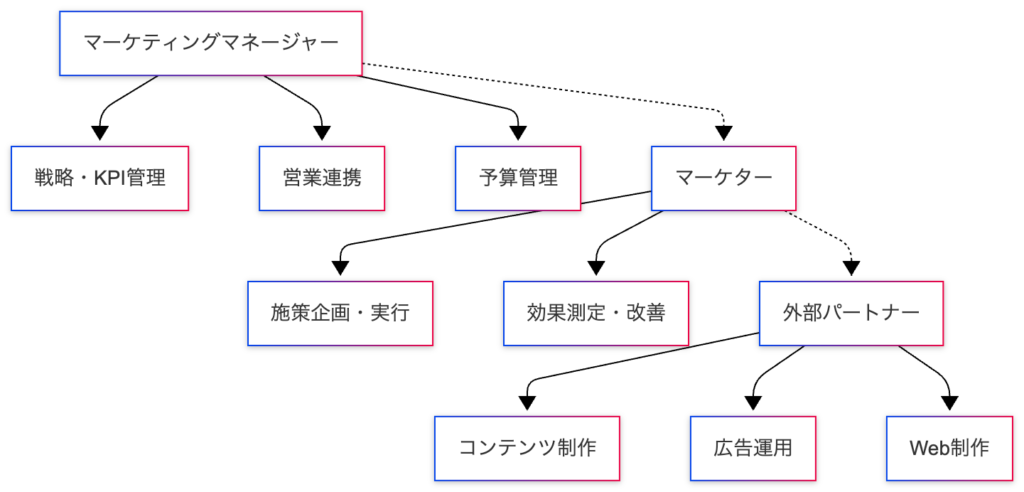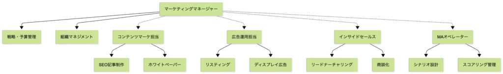 | マーケティングマネージャー | 戦略立案、経営・営業との調整、予算管理 | 戦略思考、BtoBマーケ経験 | 社内異動or中途採用 |