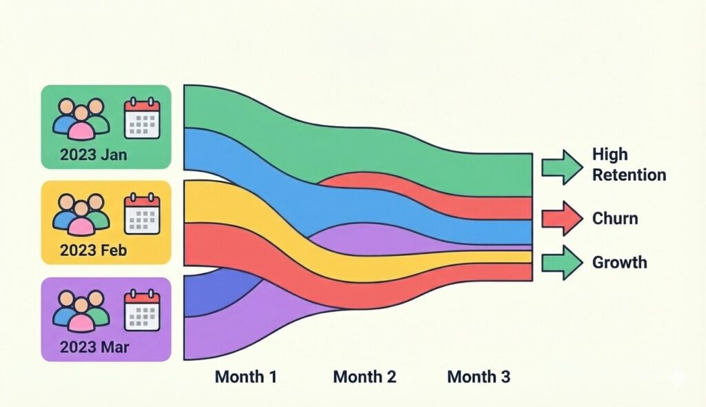 コホート分析行動変化の追跡と離脱予測時系列での動的な変化いつ、なぜ行動が変わるか継続率改善、離脱防止