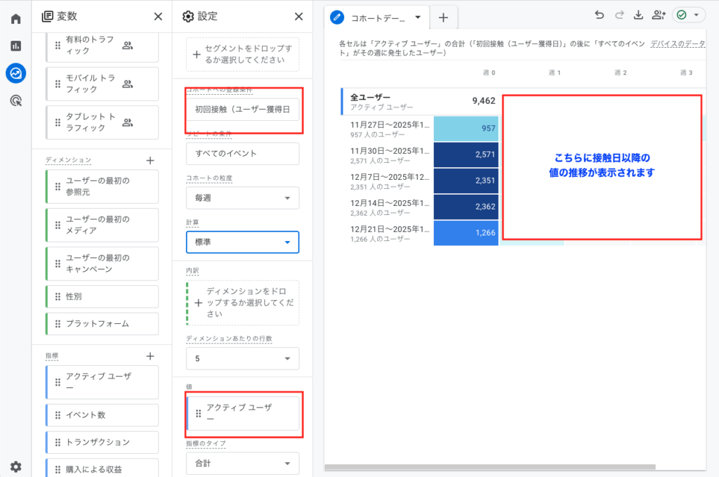 • 数値:そのコホートのうち、指定日数後にサイトを再訪したセッションの割合