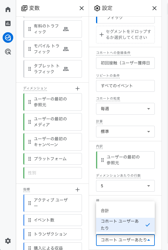 最低でも100ユーザー以上のコホートで分析することを推奨します。もしユーザー数が少ない場合は、コホートのサイズを「日別」から「週別」や「月別」に変更して、各コホートのサンプル数を増やしましょう。