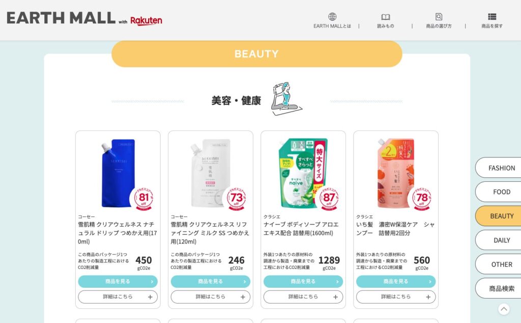 楽天の「EARTH MALL with Rakuten」は、環境や社会に配慮した商品を集めたことで、2022年の流通総額が前年比で211%増加しました。2024年11月には、消費やサービスのCO2排出量削減率が一目で分かる「デカボスコア」付きの商品を集めた特設ページを公開し、ユーザーからの支持を拡大しています。