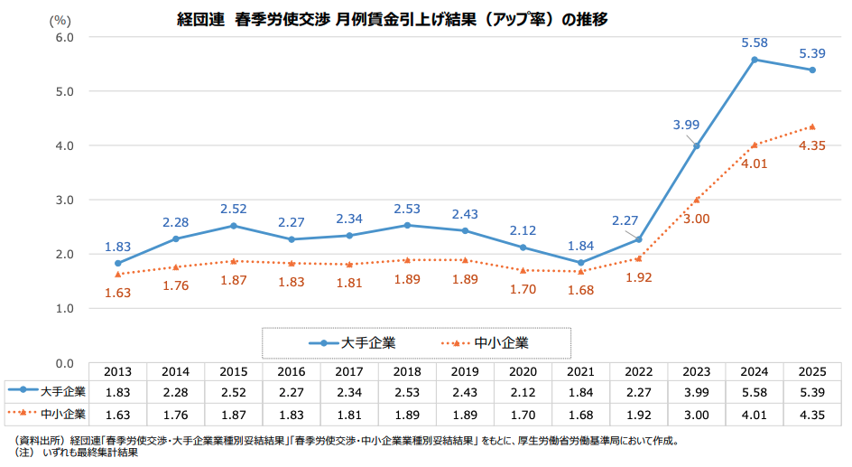 「給料を上げたいけど、原資がない」「大企業と違って、中小企業には賃上げは難しい」──多くの中小企業経営者がこのような悩みを抱えていませんか。実際、2025年の経団連の調査では中小企業の賃上げ率は4.35%と、大企業の5.39%と比べて約1ポイント低い状況です。