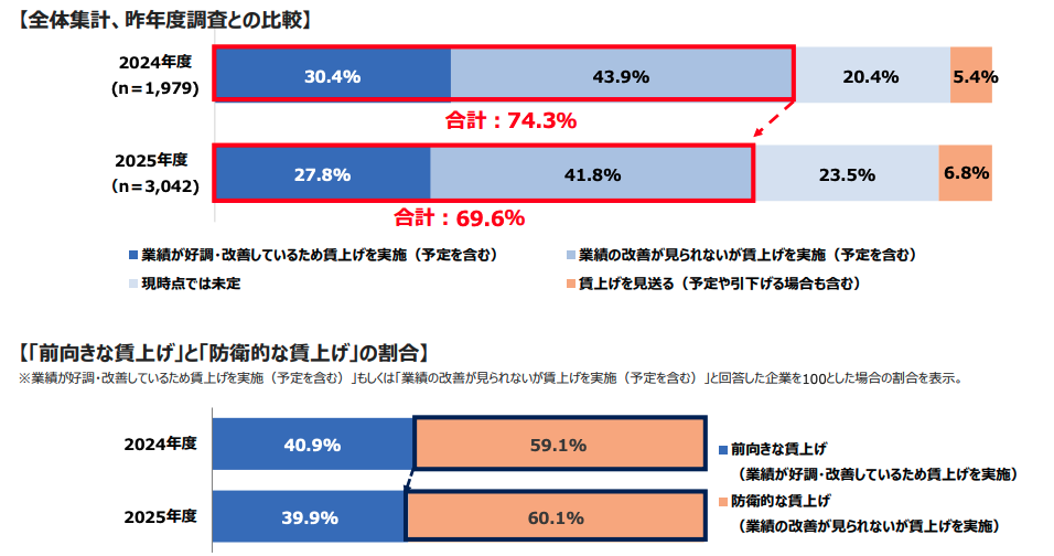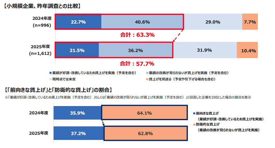 さらに深刻なのは、従業員20人以下の小規模事業者です。賃上げ実施率は57.7%と昨年より5.6ポイント低く、その中でも防衛的賃上げの割合は62.8%に達します。小規模事業者ほど、賃上げの原資確保に苦しんでいる実態が数字に表れています。