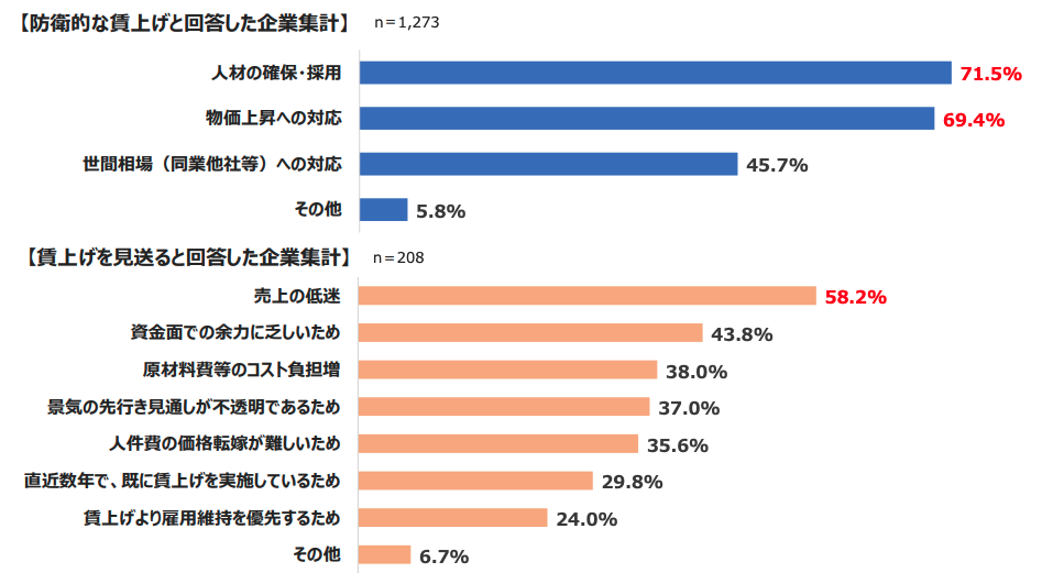 業績が好調で前向きに賃上げを実施できる企業はわずか27.8%にとどまり、残りの41.8%は「業績の改善が見られないが賃上げを実施」する、いわゆる「防衛的賃上げ」を行っています。つまり、中小企業の約6割は、利益が出ていないにもかかわらず、人材確保のために賃上げせざるを得ない状況に追い込まれているのです。