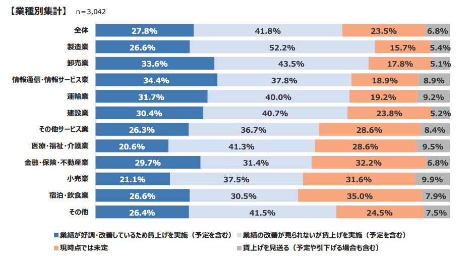 小売業の賃上げ率は3.50%と、全業種の中で最も低い水準となっています。業績が好調で前向きに賃上げを実施する企業はわずか21.1%にとどまり、厳しい状況がうかがえます。