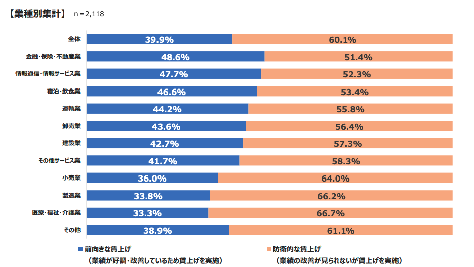 医療・福祉・介護業の賃上げ率は2.61%と、全業種の中で最も低い水準です。賃上げ企業の66.7%が防衛的な賃上げとなっており、業績改善が伴わない中での賃上げが大半を占めます。