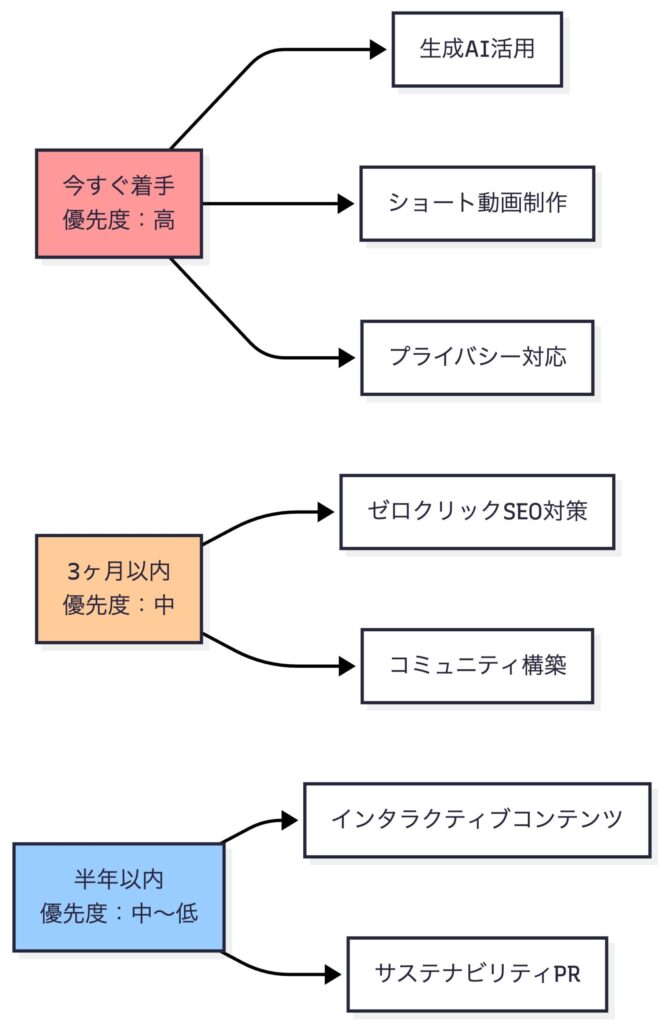 | 3. ショート動画の支配的地位 | TikTok、YouTube Shorts、Instagram Reelsが主流に | 動画制作スキルが必須、テキストコンテンツだけでは不十分 | ☑ スマホで撮影→簡単編集の短尺動画を週1本投稿 ☑ 縦型動画フォーマットに最適化 ☑ 最初の3秒で惹きつける構成 |