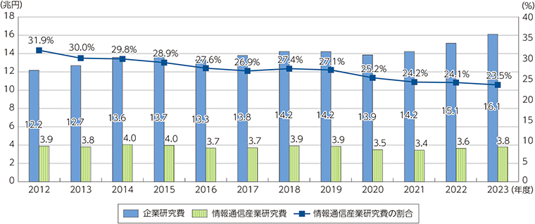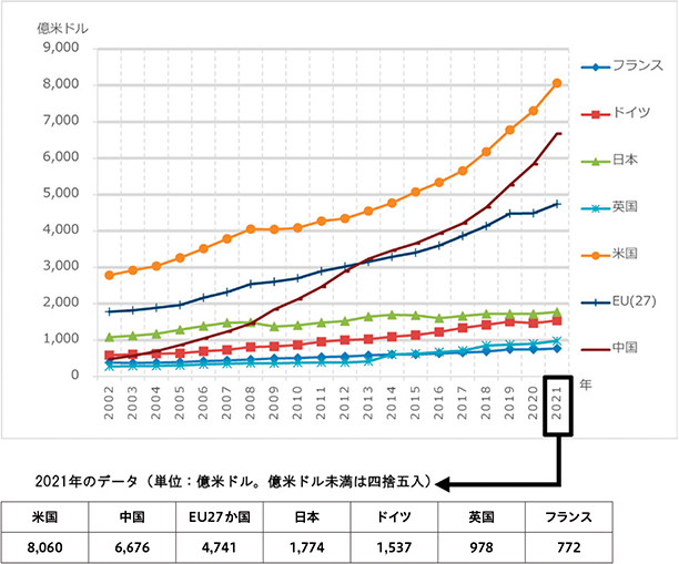 イノベーション創出における日米の差も、企業価値格差の重要な要因の一つです。総務省の調査によると、日本企業のR&D(研究開発)は年々増えており、2023年にはここ10数年で過去最高となっています。しかし、アメリカや中国の投資額の差は激しいです。