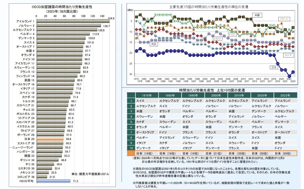この数字が示す意味は非常に重要です。労働生産性とは、働く人一人が一時間でどれだけの価値を生み出せるかを示す指標であり、これが低いということは、同じ時間と人数で働いても、生み出される付加価値がアメリカ企業の6割程度に留まってしまうことを意味します。