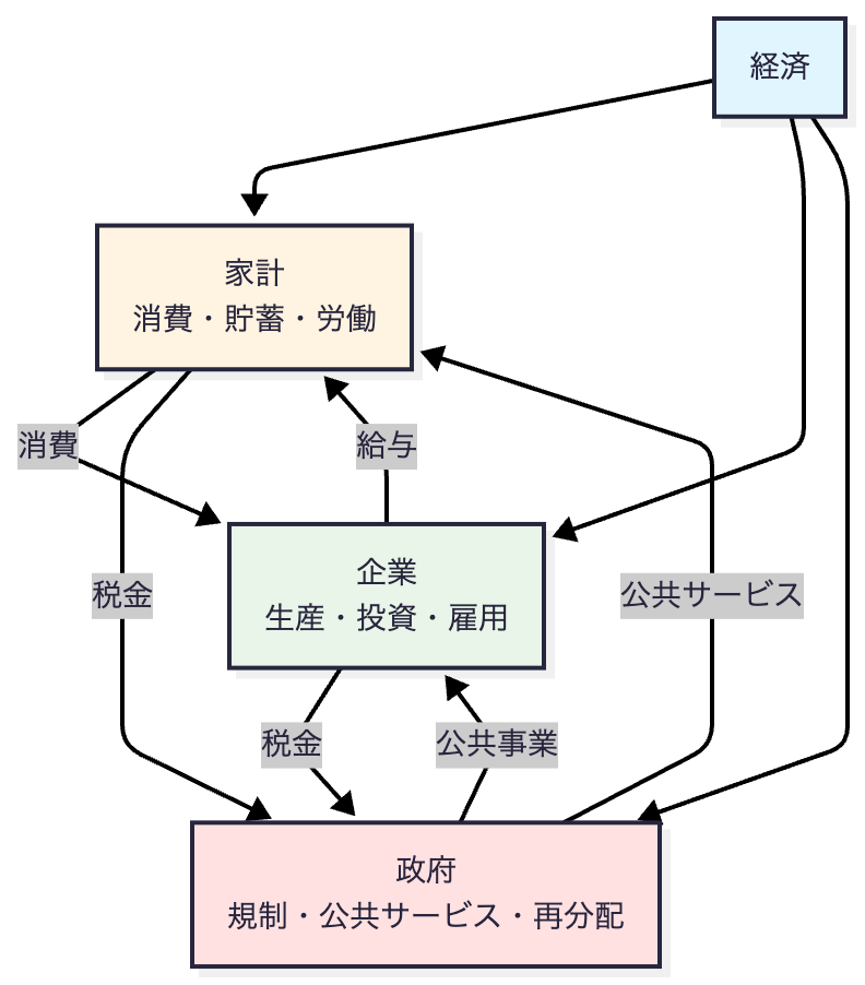 家計は消費と労働を通じて経済に参加し、企業は生産活動を行い、政府は市場の調整役を果たします。この3者の相互作用が「経済」を形成しているのです。