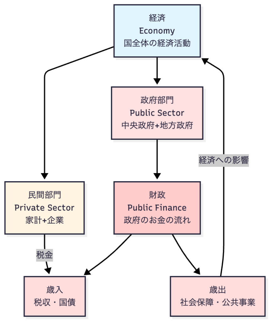 この図からわかるように、財政は経済の一部であり、財政を通じて政府が経済全体に影響を与えるという関係になっています。