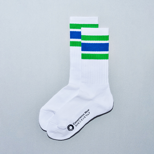 ソックス類ラインソックス、ショートソックス390円~ファミマカラーを使ったアイコニックなデザイン。ソックスから火がついた。