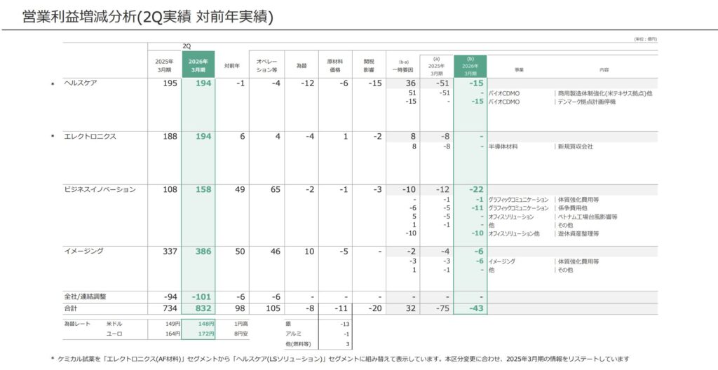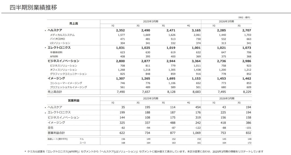 バイオCDMO事業は2Q売上663億円(前年比+37.9%)と急成長しました。しかし営業利益への貢献は限定的で、ヘルスケア全体の営業利益は-0.5%と微減でした。