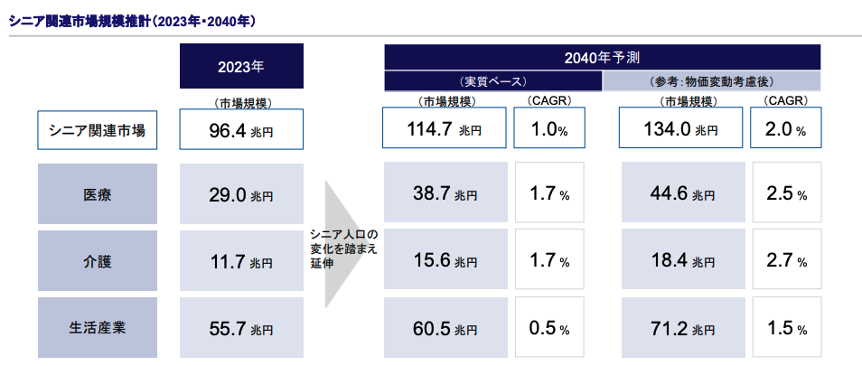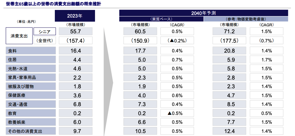 戦後の高度経済成長期を経験した団塊世代は、豊富な貯蓄と年金を持ち、若年層と比較して可処分所得が多い層です。2040年予測だとシニア層の各種支出が2023年対比で0.5%以上増加すると言われています。