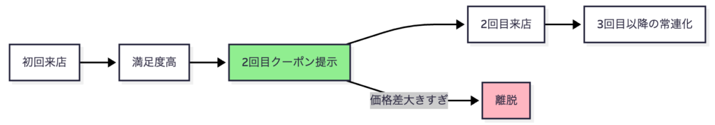 | 3回目 | 特定メニュー15%OFF | 試してほしいメニューを提案 | 顧客単価を上げる |