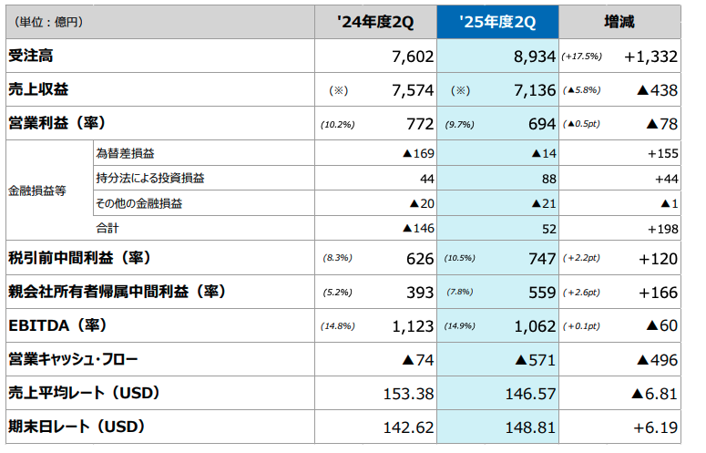 2025年11月、総合重工大手のIHIが第2四半期決算を発表しました。注目すべきは、受注高が過去最高の8,934億円に達し、当期利益も過去最高の559億円を記録したことです。一方で、売上収益は前年同期比で438億円減、営業利益も78億円減と減収減益となっています。