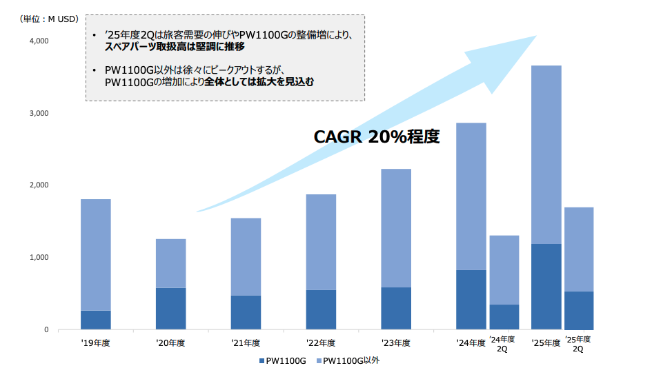一時的要因を除いた実力ベースで見ると、航空・宇宙・防衛セグメントのスペアパーツ事業が堅調に拡大しています。民間エンジン事業のスペアパーツ取扱高は、対2019年度比で200%の水準に達しており、CAGR(年平均成長率)は約20%です。これは旅客需要の回復とPW1100Gエンジンの整備需要増によるもので、中長期的にも持続可能な成長ドライバーといえます。