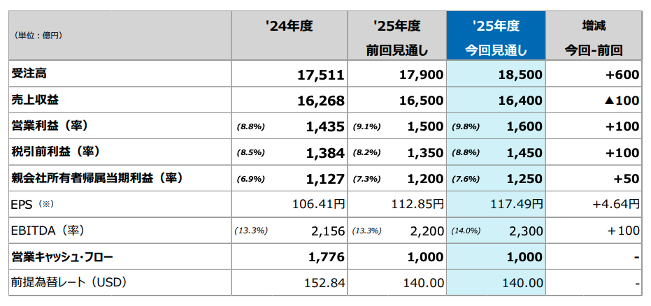 | 受注高 | 1兆7,900億円 | 1兆8,500億円 | +600億円 |