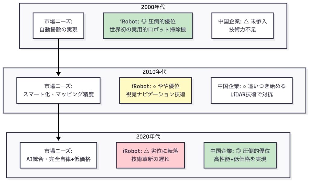 iRobotは初期の「自動化」では優位性を持っていましたが、競合プロダクトでも自動化は当たり前になり、高度な機能+低価格にシフトする中で、中国企業に追い抜かれました。特に重要なのは、顧客が求める価値が「ブランド信頼性」から「実用的性能とコストパフォーマンス」に完全に移行した点です。