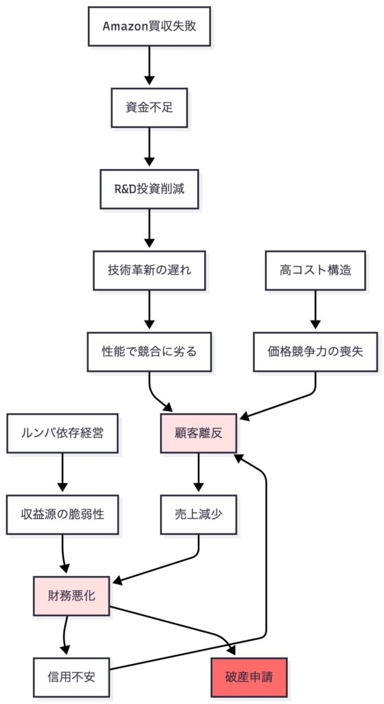 iRobotは自力再建ではなく、Amazon買収による救済に過度に依存しました。買収が破談になった後の「プランB」が不十分だったため、急速に経営が悪化しました。