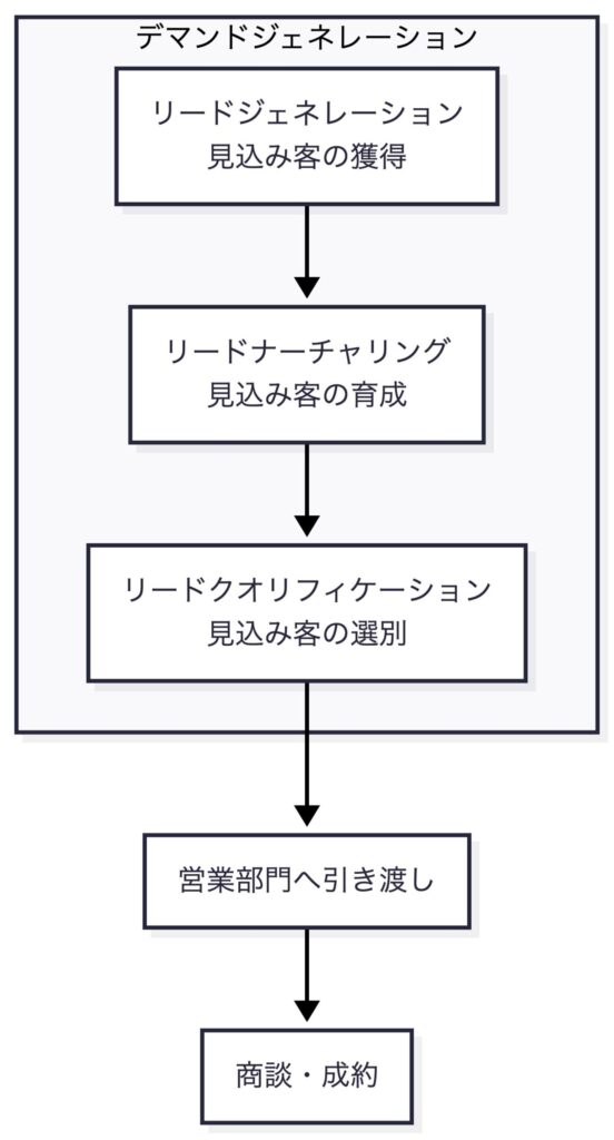 | リードジェネレーション | 見込み客の「獲得」 | 広告、コンテンツマーケティング、展示会、セミナーなど | マーケティング |