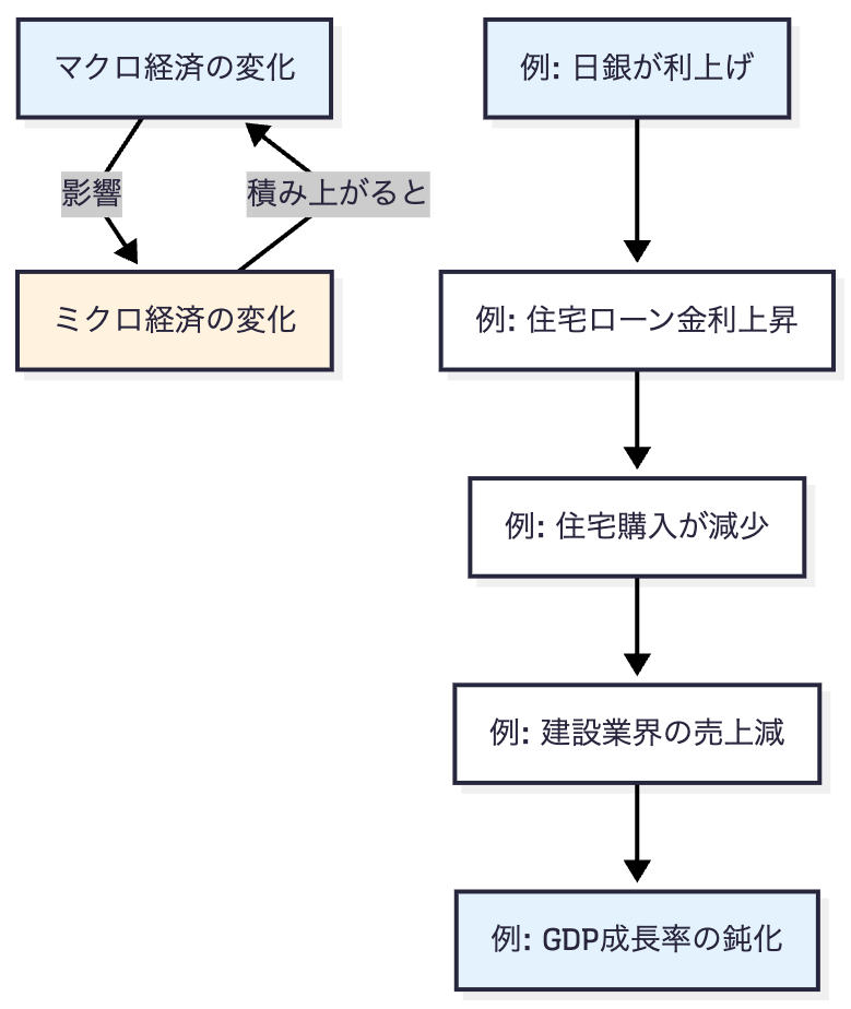 2024年、日銀が段階的に金利を引き上げました(マクロ経済政策)。その結果、銀行の住宅ローン金利も上昇し(ミクロ経済への波及)、住宅購入を検討していた個人が様子見に転じました(ミクロの消費者行動)。これにより、住宅メーカーや不動産会社の販売が減少する可能性があります(ミクロの企業業績)。