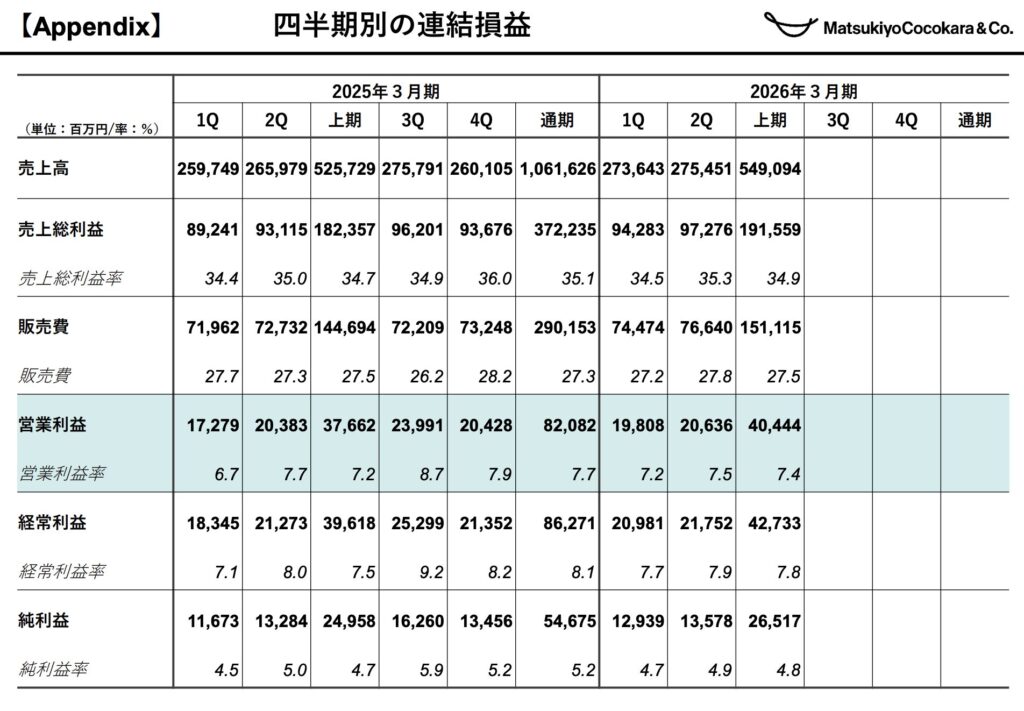 マツキヨココカラ&カンパニーが2025年11月13日に発表した2026年3月期第2四半期決算は、第2四半期累計期間として過去最高の売上・利益を記録しました。売上高は前年同期比4.4%増の5,490億円、営業利益は7.4%増の404億円と、計画を上回る好調な業績です。