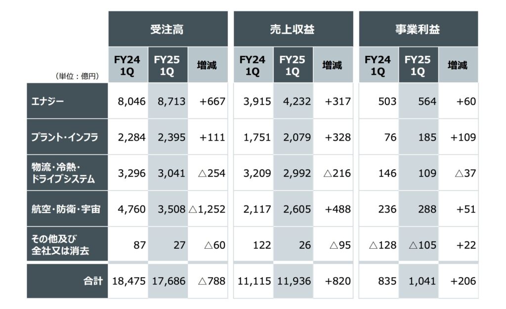 まずは今回の決算における全体像を整理してみましょう。三菱重工業の2025年度第1四半期(2025年4月~6月)の業績は、以下のような結果となりました。