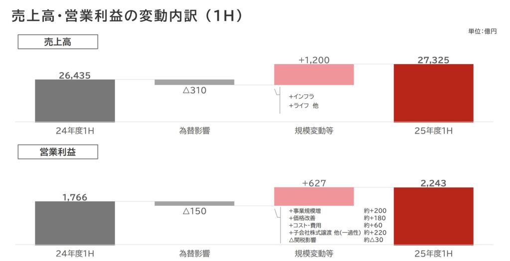 上期の営業利益+476億円のうち、約220億円は一過性収益ですが、それを除いても実力ベースで約+250億円(+14%)の増益を達成しています。為替は逆風だったにもかかわらず、事業規模の拡大、価格改善、コスト削減により収益性を向上させています。