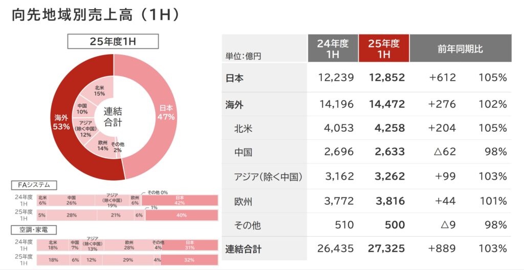 FAシステム事業(工場自動化機器)は、売上高3,780億円(+7.5%)、営業利益340億円(+45.3%)と好調です。特に注目すべきは、中国・台湾・国内でのAI関連半導体製造装置向けの需要増加を捉えている点です。