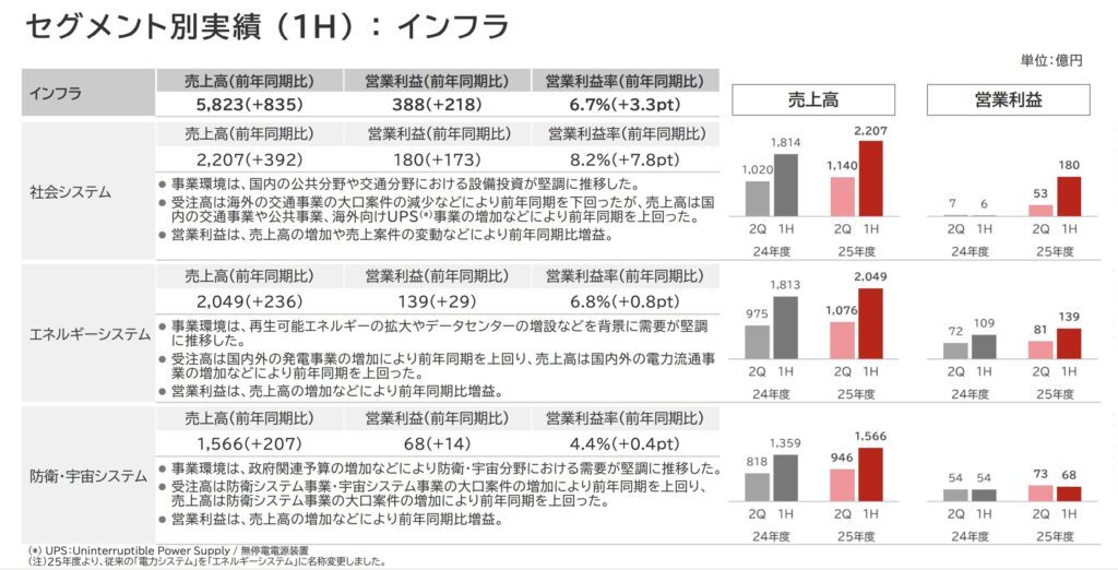 インフラセグメントが売上・利益ともに成長を牽引しています。特に社会システム事業は営業利益が173億円増加し、利益率が0.4%から8.2%へと劇的に改善しました。エネルギーシステムや防衛・宇宙システムも堅調です。