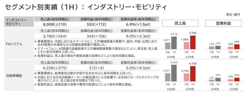 FAシステム事業や自動車機器事業では、価格改善が利益率向上に直結しています。特に自動車機器は売上高が前年同期比△8.1%と減少したにもかかわらず、営業利益は+2.9%増加しました。これは、顧客に対する価格交渉力があることの証明です。
