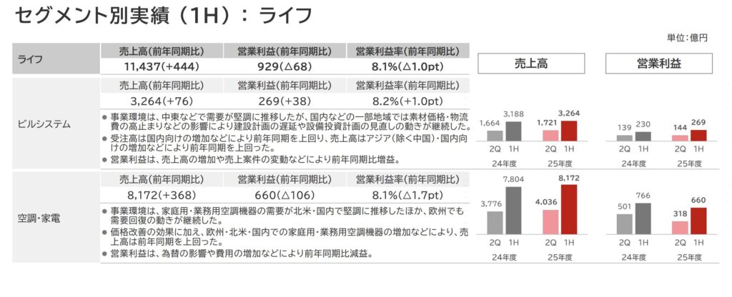一方、ライフセグメントは売上は伸びたものの利益は減少しました。これは主に空調・家電事業で、欧州・北米での販売は好調だったものの、為替影響や費用増加により利益が圧迫されたためです。