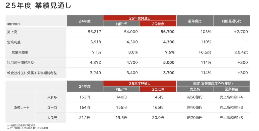 • 売上高:通期5兆6,700億円、上期2兆7,325億円 → 下期2兆9,375億円(上期比+7.5%)