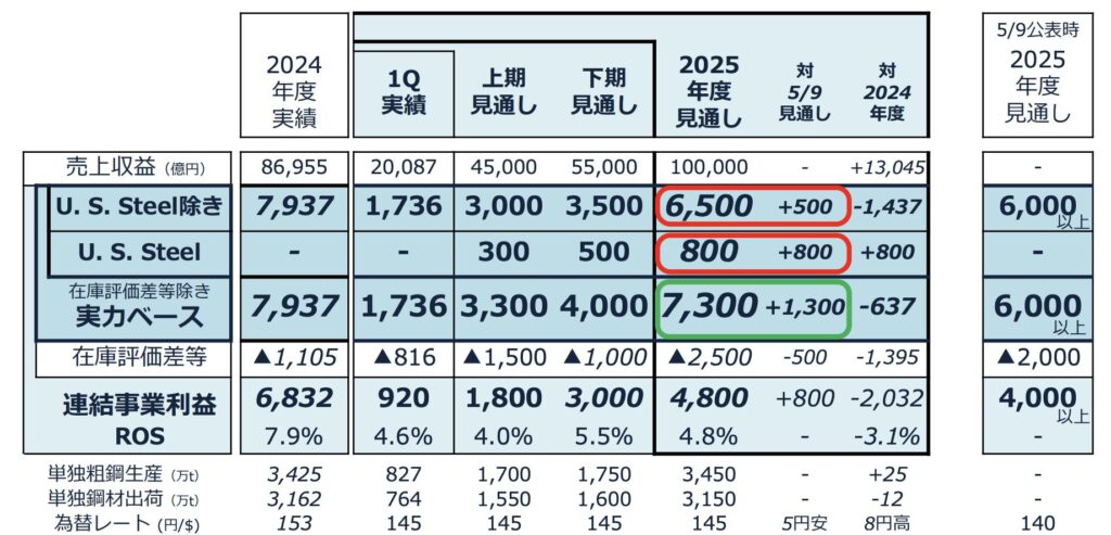 在庫評価差や一過性の損失を除いた、いわば「本業の実力」を示す指標が実力ベース事業利益です。同社は2025年度通期で、U.S. Steel統合の影響を除いても6,500億円(前回公表比+500億円)の実力ベース事業利益を見込んでいます。さらにU.S. Steelの9か月分(2025年7月~2026年3月)の利益貢献800億円を加えると、7,300億円(前回公表比+1,300億円)に達する見通しです。