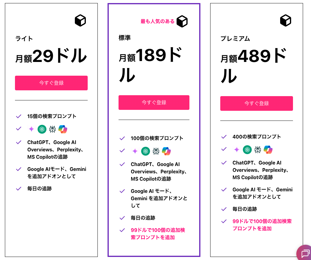 ソロマーケターやフリーランサーには10プロンプトで十分ですが、代理店やコンテンツチームは規模を拡大したいでしょう。特に複数のクライアント、競合、または業種を追跡している場合はプレミアムが適しています。