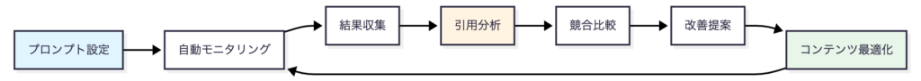実践的な使い方: 最も重要な10プロンプト(ブランド名+主要カテゴリー)に絞り、集中的に改善。毎週のレポートを確認し、1つずつ可視性を高めていく。
