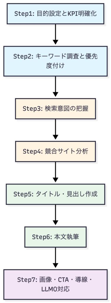 まずはオウンドメディア記事の作成の全体像を押さえていきましょう。記事作成は、以下の7つのステップで進めていきます。各ステップを丁寧に実行することで、質の高い記事を効率的に生産できるようになります。