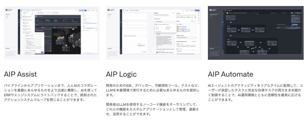 特に注目すべきは、2023年に本格展開を始めたAIP(Artificial Intelligence Platform)です。これは、ChatGPTに代表される生成AIブームの中で、企業が実務でAIを活用するための基盤となるプラットフォームです。単にAIを使えるだけでなく、企業の既存データと統合し、セキュリティを確保しながら、業務に直結する形でAIを活用できる点が特徴となっています。