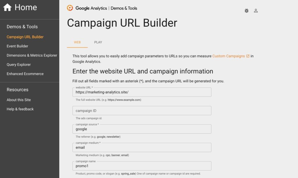 手動でUTMパラメータを作成するとミスが起きやすいため、Googleが提供している「Campaign URL Builder」を使用することをお勧めします。