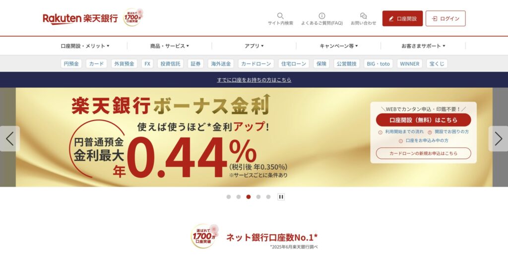 2025年7月から、個人の円普通預金に対して「ボーナス金利」プログラムを開始しました。これは、楽天カードの口座振替や楽天証券との連携(マネーブリッジ)に加えて、メイン口座化やサービスのクロスセルを促進する優遇金利プログラムです。